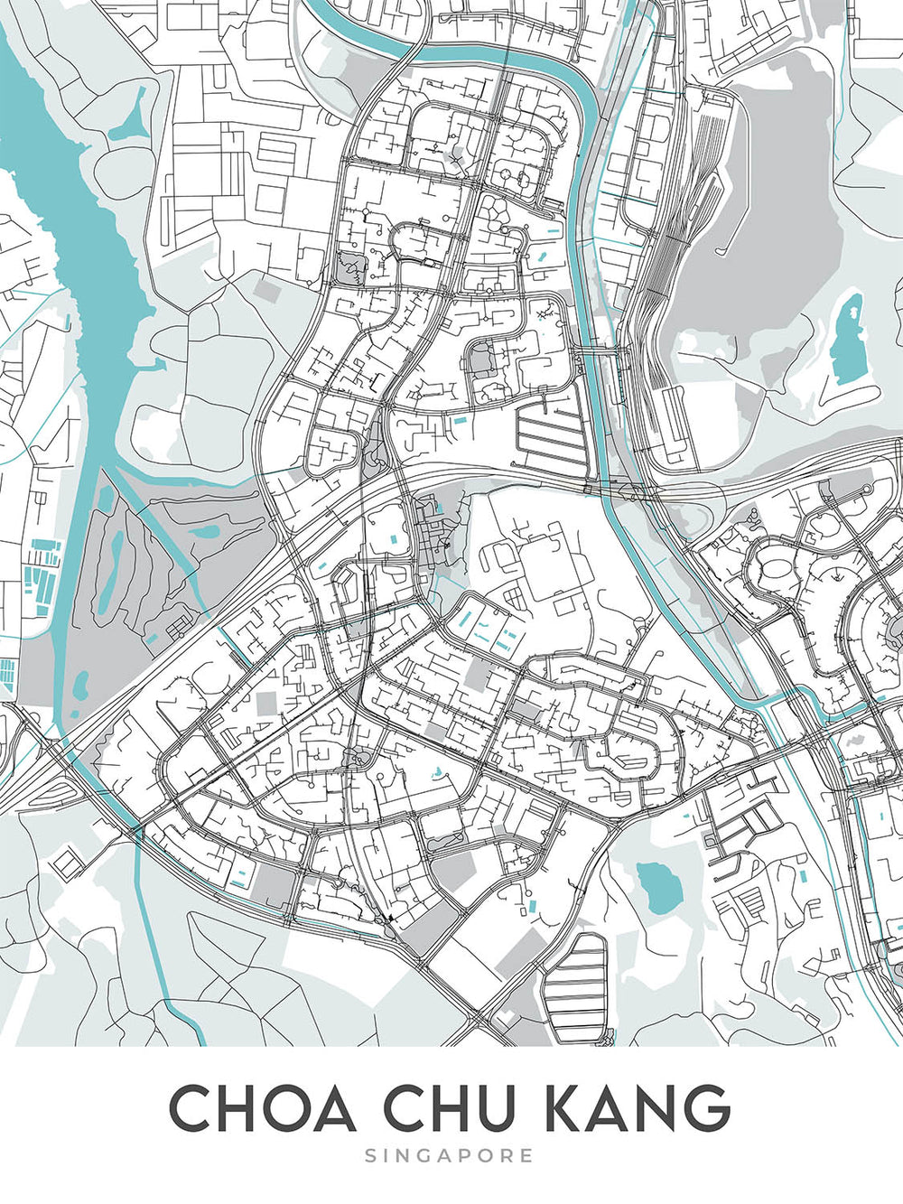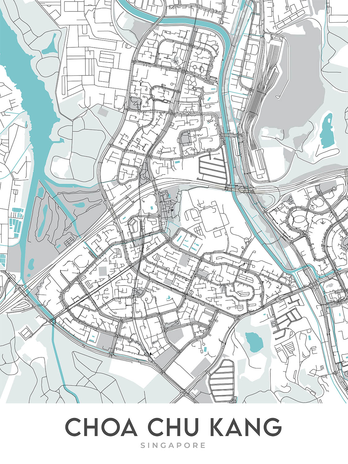 Incorporating this map into home decor not only adds a layer of urban sophistication but also serves as a conversation starter, offering stories of a well-loved neighborhood articulated through the language of modern map-making. It’s an innovative intersection of art and geography, where each line and color shift tells a story of community, connectivity, and urban aesthetics. Ideal for those who value precision and style, this map is a tribute to both the legacy and the contemporary allure of Choa Chu Kang, captured through the lens of a designer’s eye.