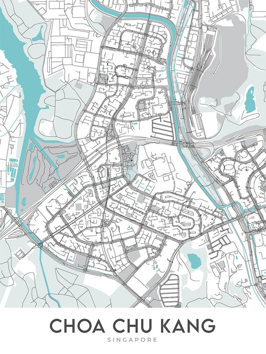 Beyond its visual appeal, the map of Choa Chu Kang by The Unique Maps Co. is a celebration of the neighborhood’s community-focused ethos. It subtly highlights key community hubs like the Choa Chu Kang MRT Station, the bustling Lot One Shoppers' Mall, and the verdant Choa Chu Kang Park. These landmarks are elegantly integrated into the design, offering a glimpse into the daily lives and interactions that define the spirit of the area. It’s an artistic rendition that connects the aesthetic with the communal, making it a meaningful piece for residents and admirers of the neighborhood alike.