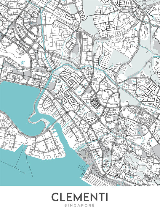 The map of Clementi, crafted by The Unique Maps Co., presents a modern interpretation of this dynamic neighborhood nestled within the bustling city-state of Singapore. Clementi, known for its blend of vibrant community life and tranquil residential areas, is vividly captured in this detailed street map. The absence of labels enhances the visual appeal, inviting viewers to immerse themselves in the clean lines and minimalist design that highlight the area's urban layout. This map intrigues not only residents and locals but also urban enthusiasts and visitors drawn to explore the unique character and spatial narratives of Clementi.