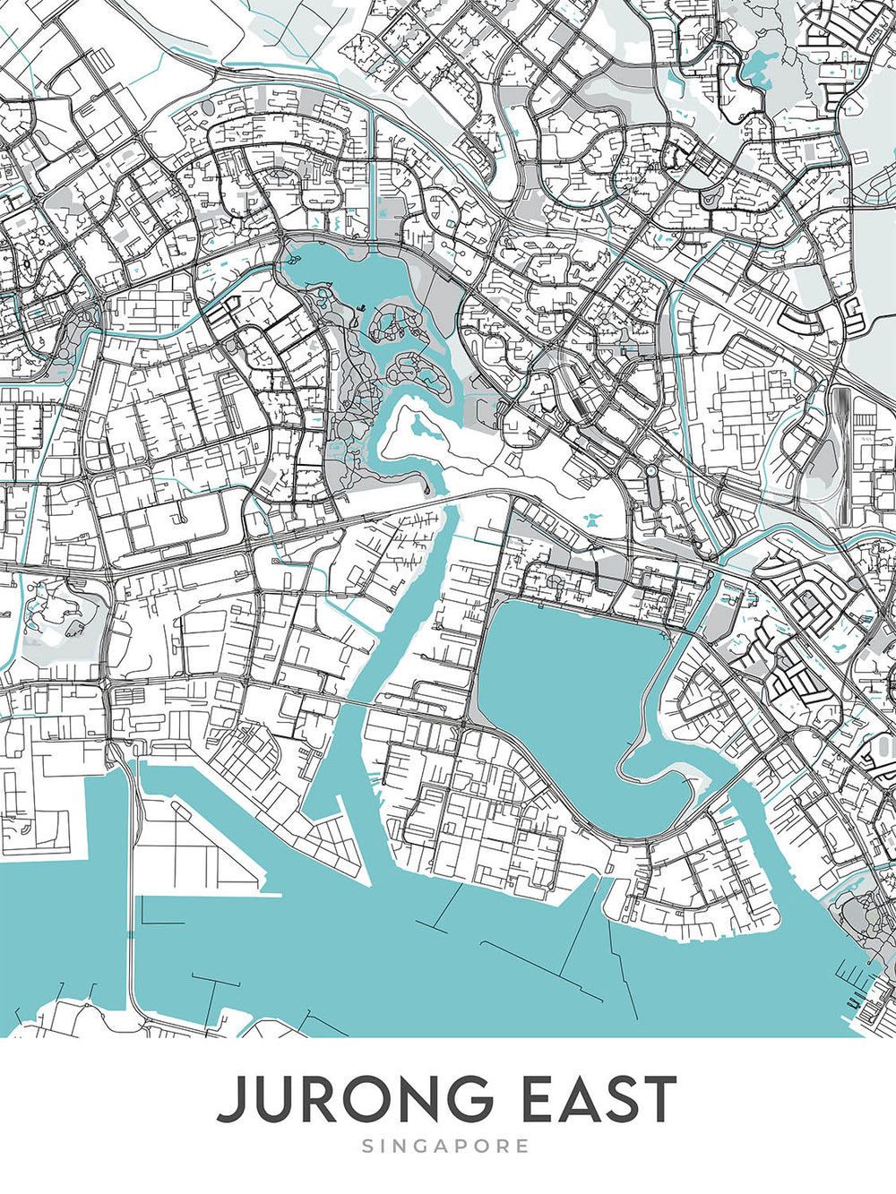 As a decor element, this map of Jurong East transcends traditional utility to become a statement piece that complements a variety of interior styles. Whether framed in a minimalist setting or used as a focal point in a more eclectic decor, it maintains its allure. The subtle color palette and detailed rendering work harmoniously to create a serene yet sophisticated atmosphere, making it a versatile choice for enhancing any room. Its modern aesthetic aligns well with contemporary furniture and design elements, bridging the gap between art and functionality.