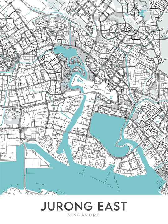 Capturing the vibrant essence of Jurong East, this contemporary map invites viewers to explore one of Singapore's most dynamic regions from a unique perspective. Jurong East, a thriving residential and commercial hub, is depicted in stunning detail, showcasing its network of roads, landmarks, and green spaces without the clutter of labels. This artistic choice elevates the map from a simple navigational tool to a piece of modern art, highlighting the neighborhood's orderly street grid and the notable landmarks that punctuate it. The map's focus on Jurong East not only reflects its current importance as a key district in Singapore but also its continual transformation and growth, making it a fascinating subject for both residents and admirers of urban design.