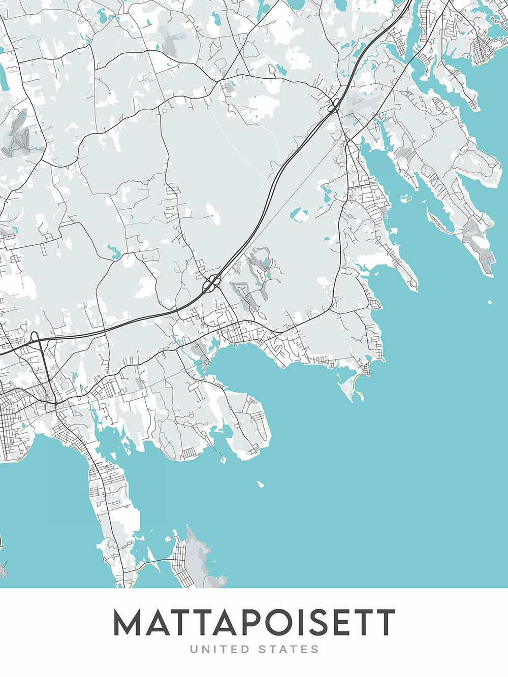 The Mattapoisett map is a modern cartographic representation of the eponymous coastal town in Massachusetts. This map focuses on the intricate details of the urban landscape, making it a visually captivating piece of art that celebrates the town's unique character. The map extends approximately 9 miles to the north and south of the town center, and 7.5 miles to the east and west, encompassing a diverse range of neighborhoods, landmarks, and natural features.