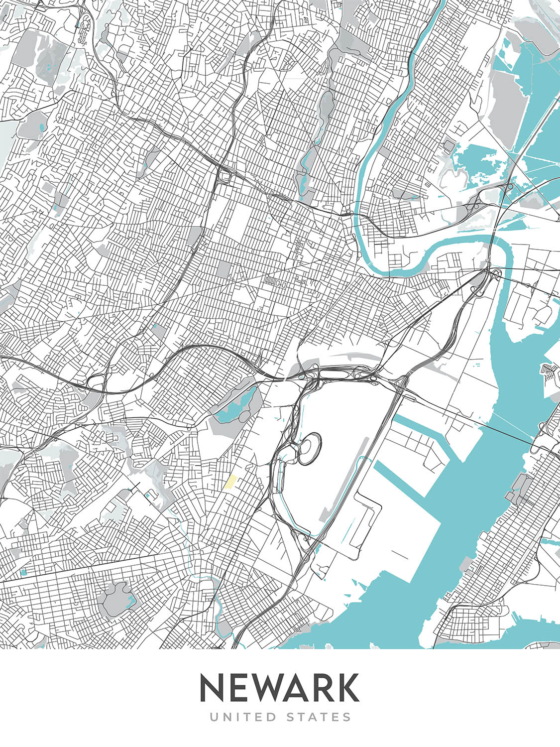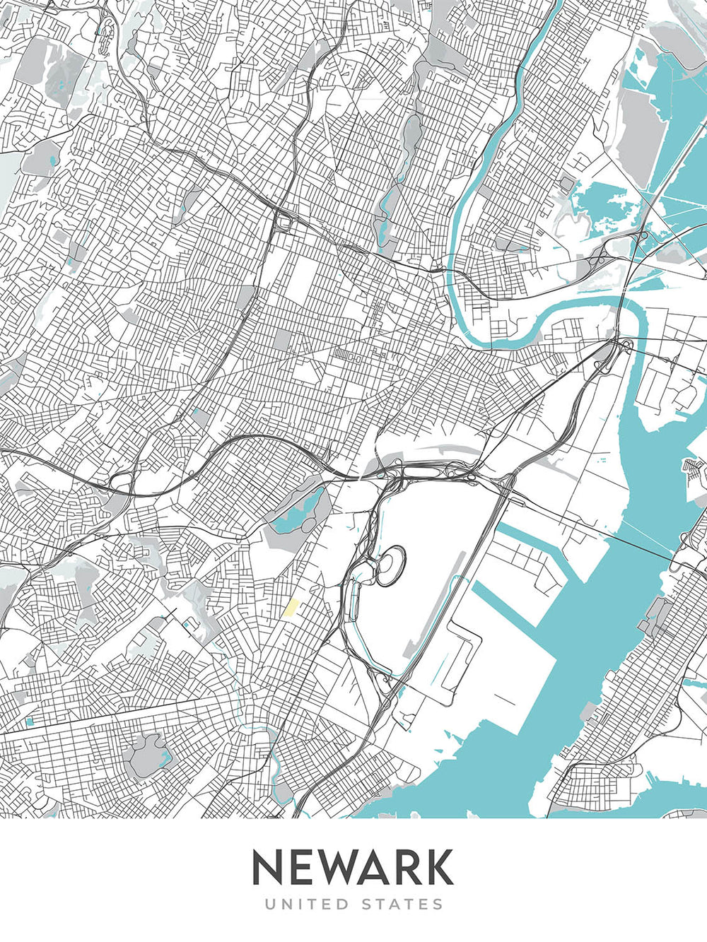 Modern City Map of Newark, NJ: Downtown, Airport (EWR), Ironbound, Prudential Center, Rutgers, NJ Turnpike