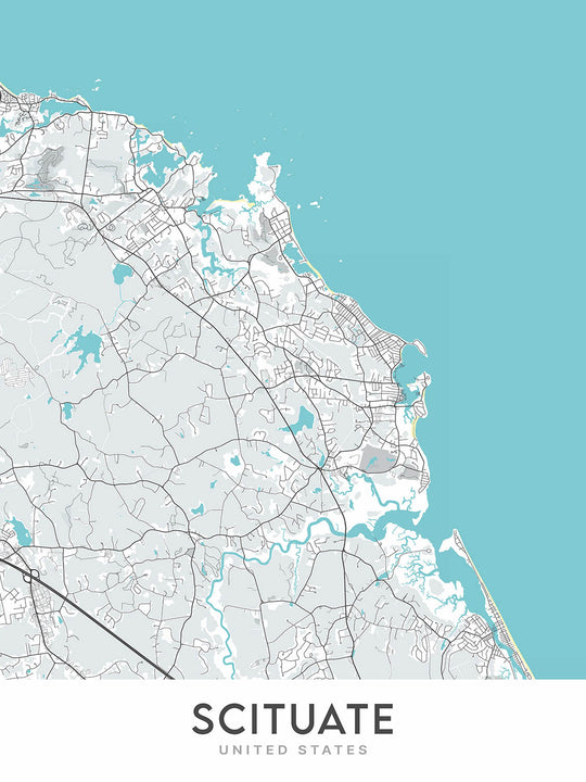 This meticulously crafted map of Scituate, Massachusetts, offers a modern and detailed depiction of this charming coastal town. The map's contemporary design and unique color palette make it a captivating piece of art, perfect for adding a touch of sophistication to any home or office.