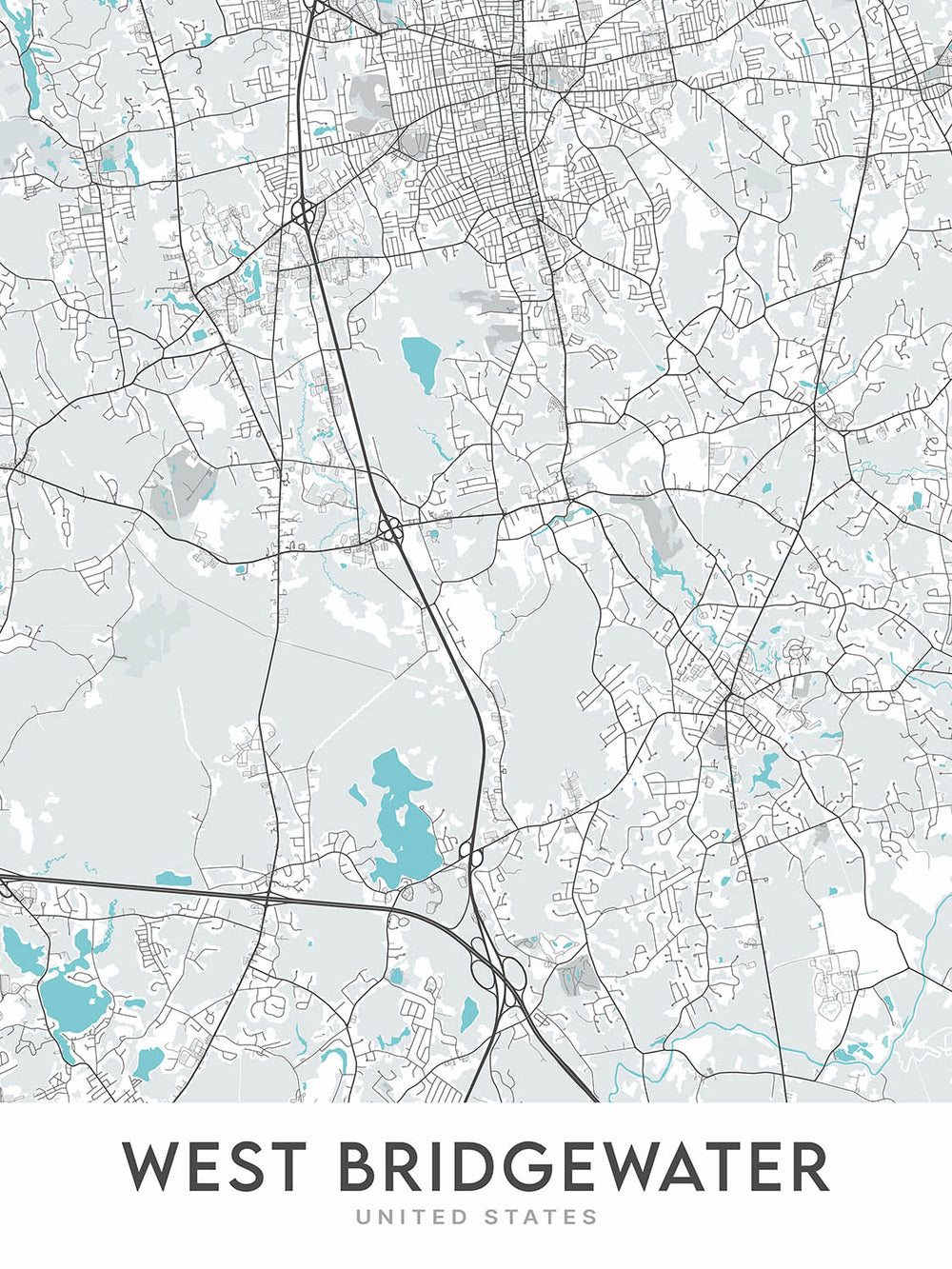 The West Bridgewater map is a modern, detailed street map of the city of Bridgewater in Massachusetts, created by The Unique Maps Co. in 2024. The map covers a large area, extending approximately 9 miles to the north of the city center, 9 miles to the south, 7.5 miles to the east, and 7.5 miles to the west. The map focuses on the intricate details of the city's street layout, making it an excellent resource for both residents and visitors alike.