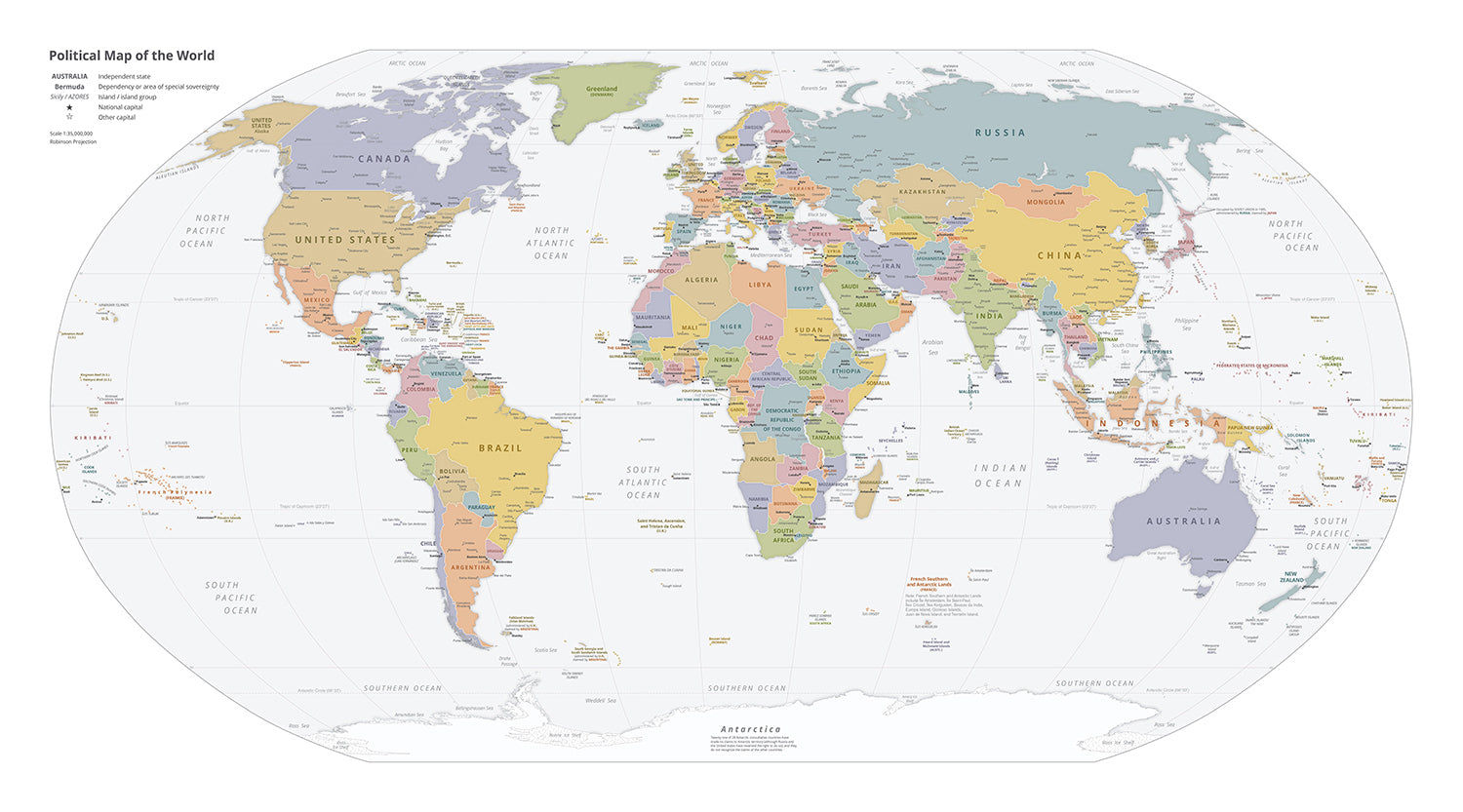 Modern World Map: Political Borders, Robinson Projection, Capitals & Major Cities