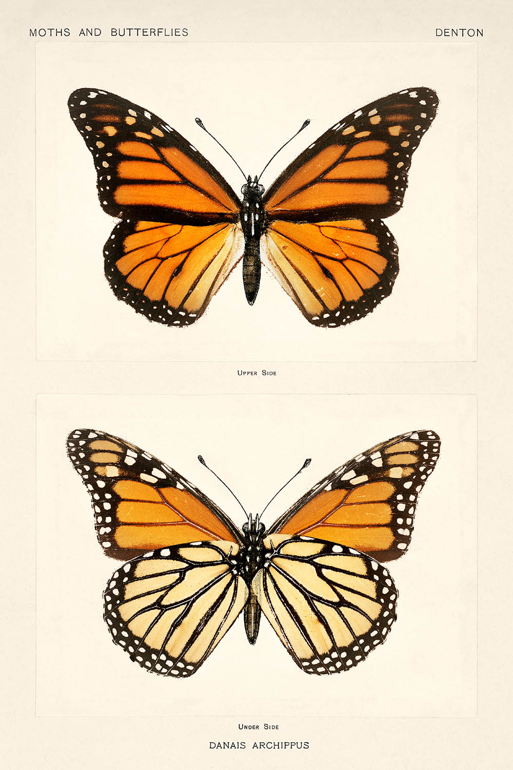 Introducing the stunning "Monarch Butterfly" (Danais Archippus) by Sherman Denton, first published in 1900. This Victorian zoological illustration captures the delicate beauty and intricate details of the Monarch butterfly in a way that is both scientifically accurate and artistically breathtaking.