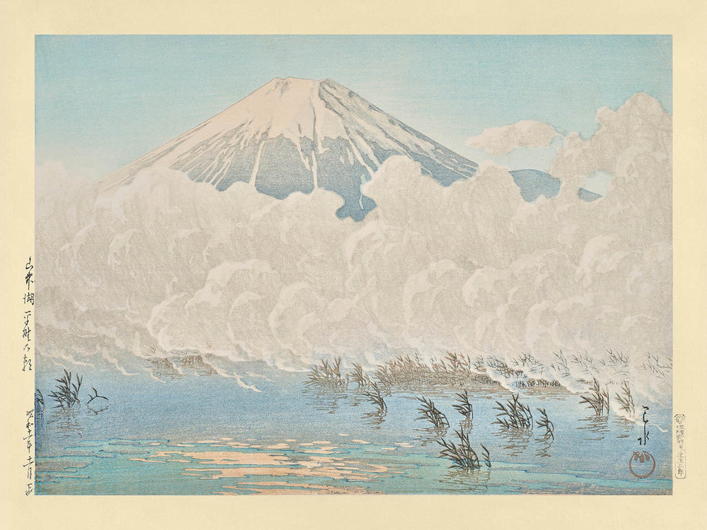 Mt Fuji. Morning at Hirano, Lake Yamanaka by Hasui Kawase is a captivating woodblock print that exemplifies the tranquil beauty of the Japanese landscape. Created in 1935, this serene composition transports the viewer to the quiet morning banks of Lake Yamanaka, where the iconic Mount Fuji rises, veiled in soft morning mists. Hasui Kawase, one of Japan's most celebrated shin-hanga (new prints) artists, produced numerous evocative images capturing the changing seasons and atmospheric moods of his homeland.