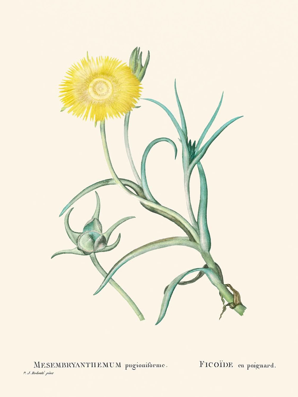 The Narrow-Leaved Iceplant illustration stands out for its precise depiction of the plant's slender, pointed leaves and vibrant yellow blooms. Redouté's use of delicate shading and balanced composition highlights the intricate details of the plant, exemplifying the elegance of botanical illustrations. This print is not only a piece of art but also a slice of botanical history that captures the spirit of early scientific explorations in botany.