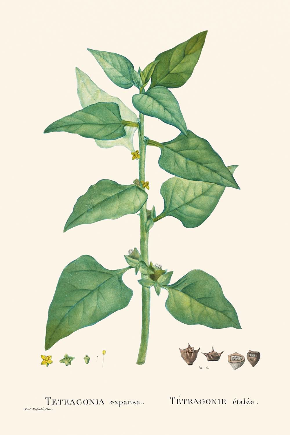 Discover the exquisite beauty of Pierre-Joseph Redouté's "New Zealand Spinach," a stunning botanical illustration first published in 1802. This artwork is a prime example of Victorian botanical illustration, showcasing Redouté's masterful ability to capture the delicate intricacies of flora. Known as one of the greatest botanical illustrators, Redouté spent much of his life painting the floral splendors of Château de Malmaison at the behest of Josephine Bonaparte, wife of Napoleon. This particular illustration, originally titled "Etragonia Expansa," captures the essence and beauty of the New Zealand Spinach.