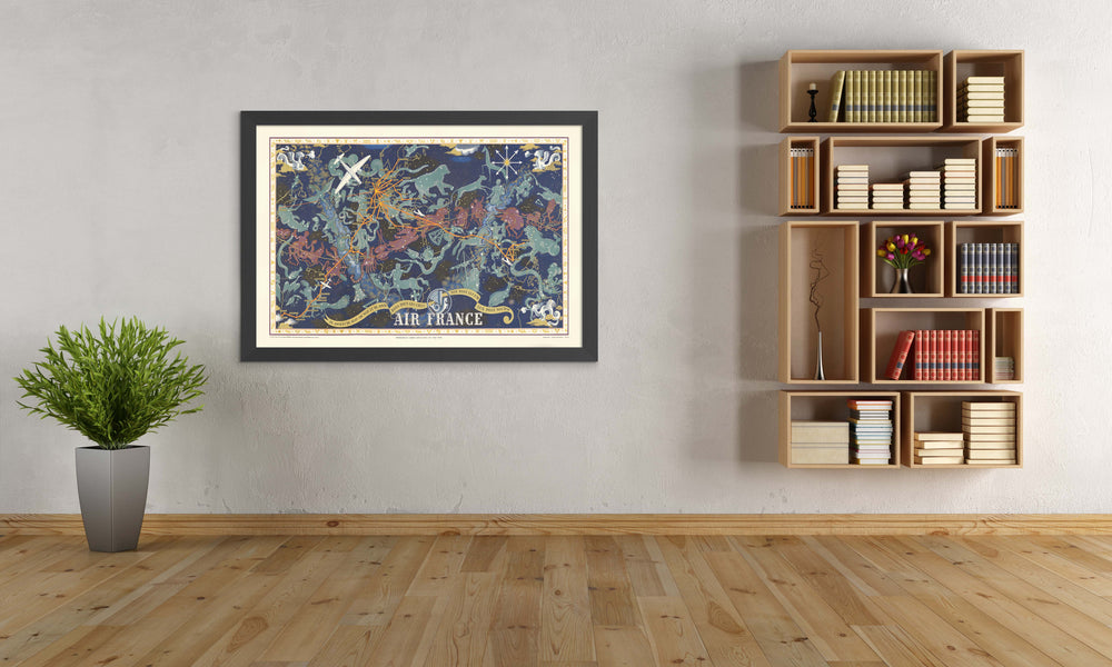 Old Air France Zodiac World Map, 1939 by Lucien Boucher: Historical Aircraft Route Celestial Wall Chart