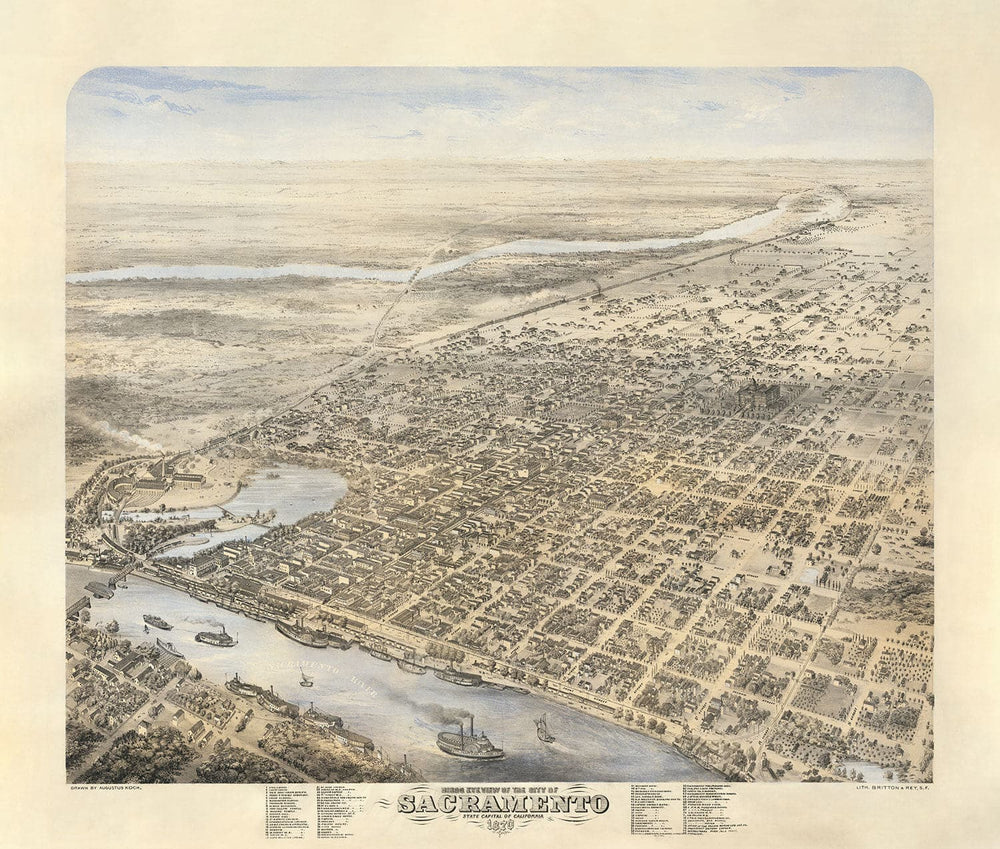 Old Birds Eye Map of Sacramento by Augustus Koch, 1870: Downtown, Midtown, California Capitol