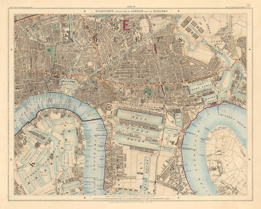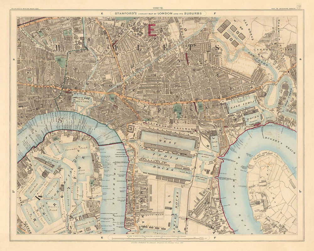 The map was originally published in 24 sheets. Altogether the map would've measured about 2 metres wide (78 inches). This here is sheet 12, which focuses on east and southeast London areas of Tower Hamlets, Limehouse, Poplar, Bow, Isle of Dogs, Surrey Quays and Rotherhithe - with a bit of Greenwich in the bottom right corner (where the O2 is today!)