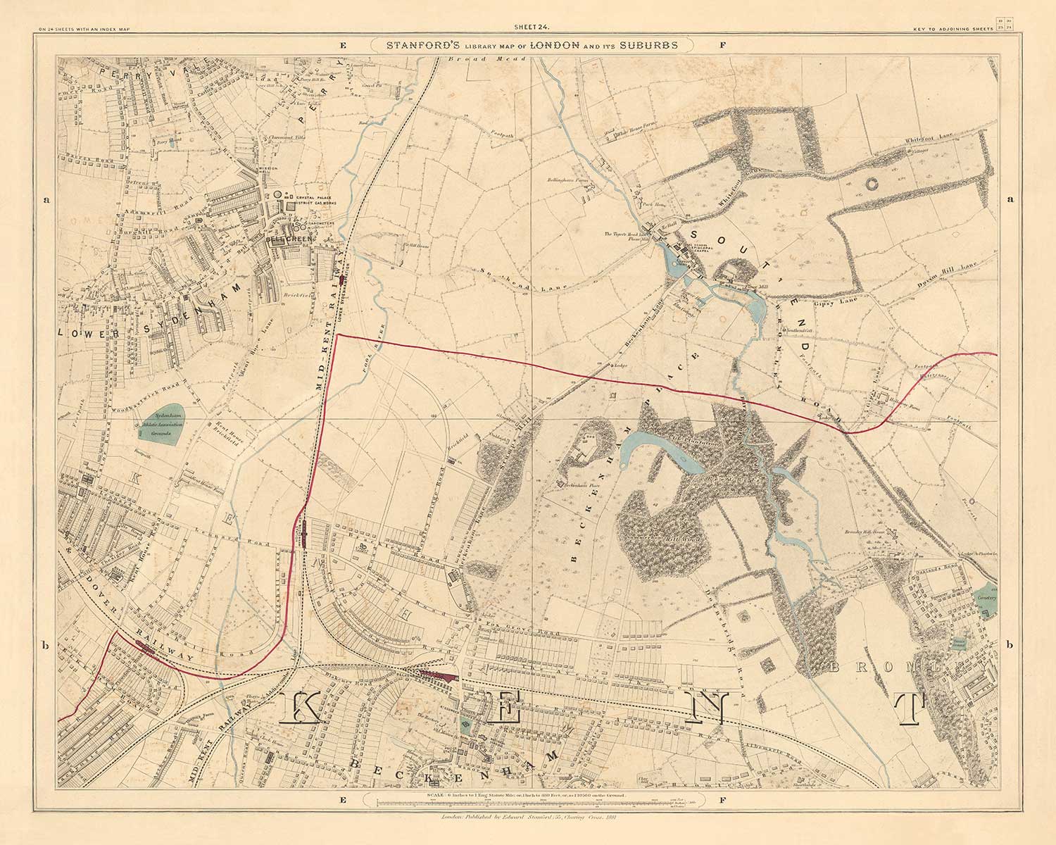 The map was originally published in 24 sheets. Altogether the map would've measured about 2 metres wide (78 inches). This here is sheet 24, which focuses on the southeast London boroughs of Bromley, Lewisham and Southwark.