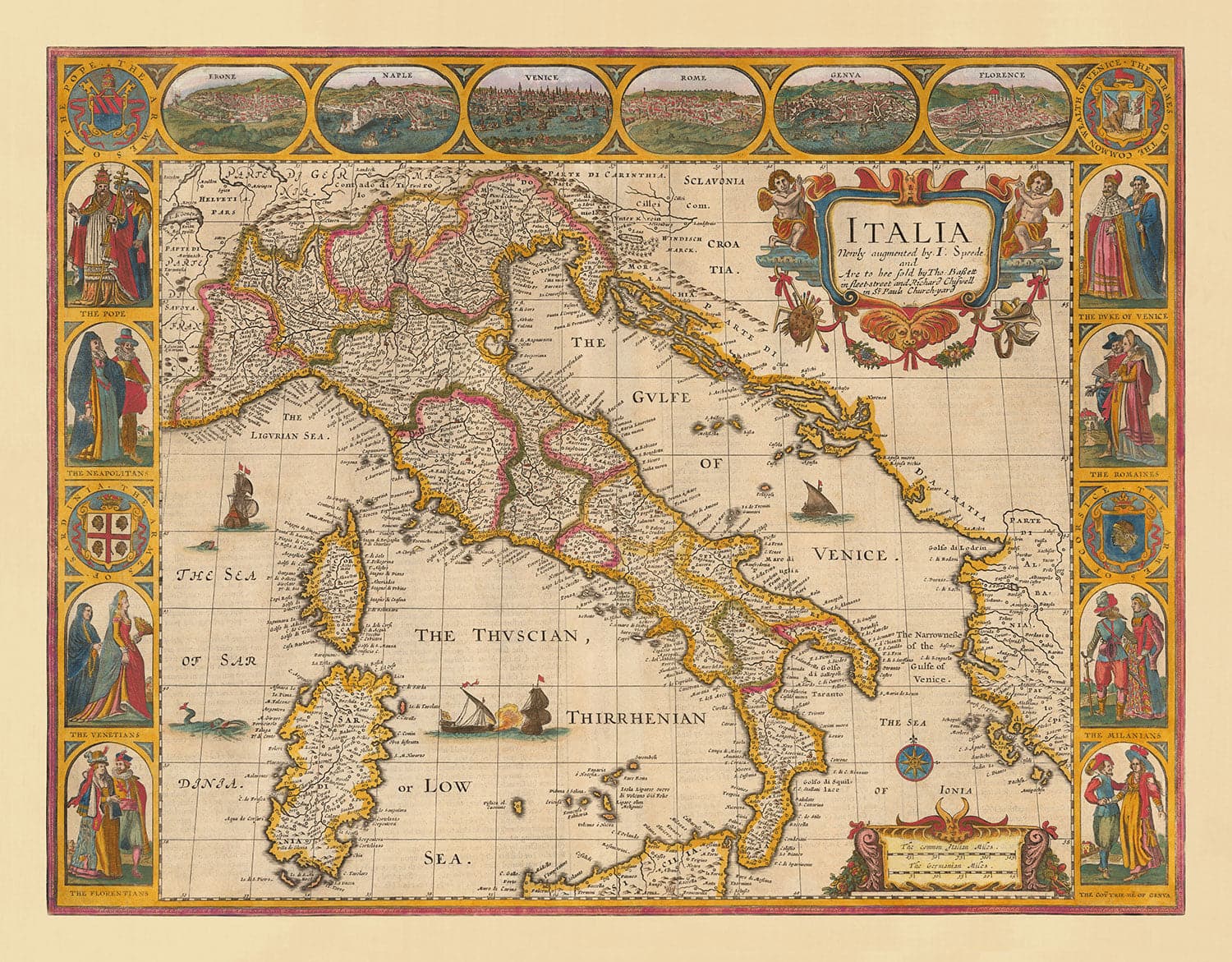 This is one of the most beautiful and decorative maps of Italy ever made. It's one of my personal favourites. If you're going to get one old map of Italy, this is the one.