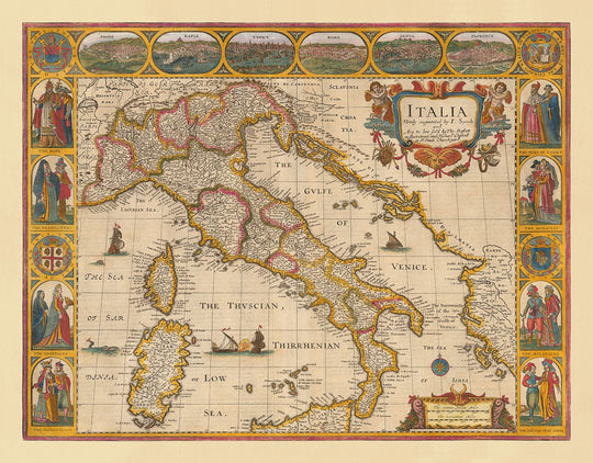 This old and exceedingly rare map shows Italy, Corsica, Sardinia and Sicily as they were in the very early 1600s. Created by one of Britain's most famed mapmakers, John Speed, the map was originally published in the twin atlases "The Theatre of the Empire of Great Britaine" and "A Prospect of the Most Famous Parts of the World."
