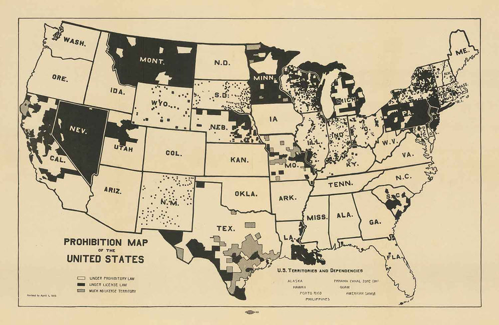 Old Map of Alcohol Pre-Prohibition in the USA, 1915: State Prohibition & Licensing Laws Before 18th Amendment