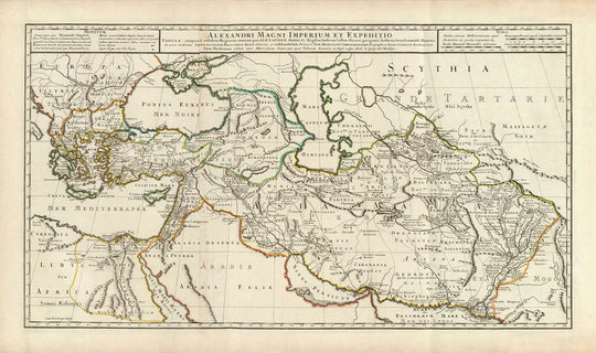 In this Latin map titled "Alexandri magni imperium et expeditiones", which translates to Alexander the Great's Empire and Campaigns, you can see the empire that Alexander the Great conquered from present-day Greece, to Egypt, throughout the Middle East and all the way to Afghanistan and parts of India.