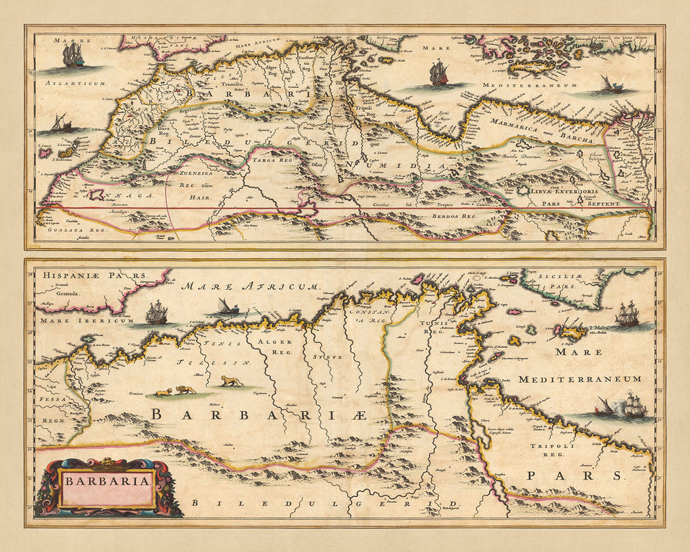 The 'Barbaria' map showcases the beauty of cartography and the artistry of its creators. Each hand-colored engraved map on the sheet serves as a testament to the mapmaker's skill and attention to detail. It covers Northern Africa and the Mediterranean, with the upper panel showing almost the entire northern coast of Africa, and the lower panel providing a detailed depiction of the area in the vicinity of present-day Algiers. The map shows political boundaries, cities, towns, waterways, canals, landmarks, wildlife, and mountains, all brought to life through the decorative title cartouche and the pictorial relief.