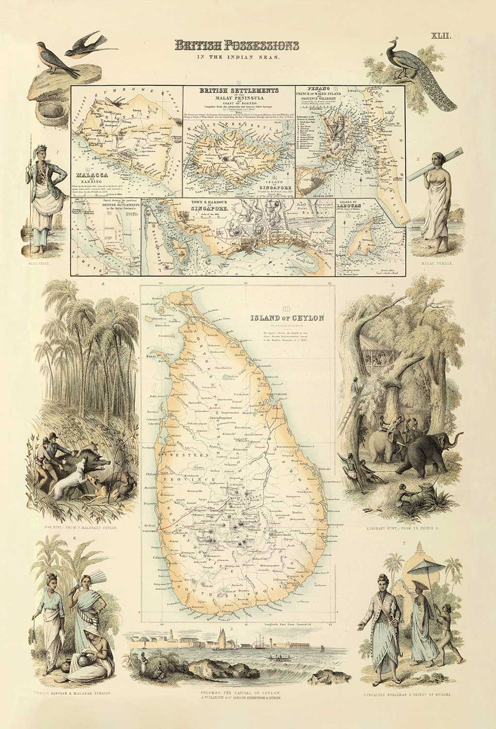 In this period, the British controlled territories in the Indian Ocean, including Singapore, Malacca, Penang, and Ceylon, now known as Sri Lanka. In addition to the main islands, there are towns and harbours of the settlements on the map.