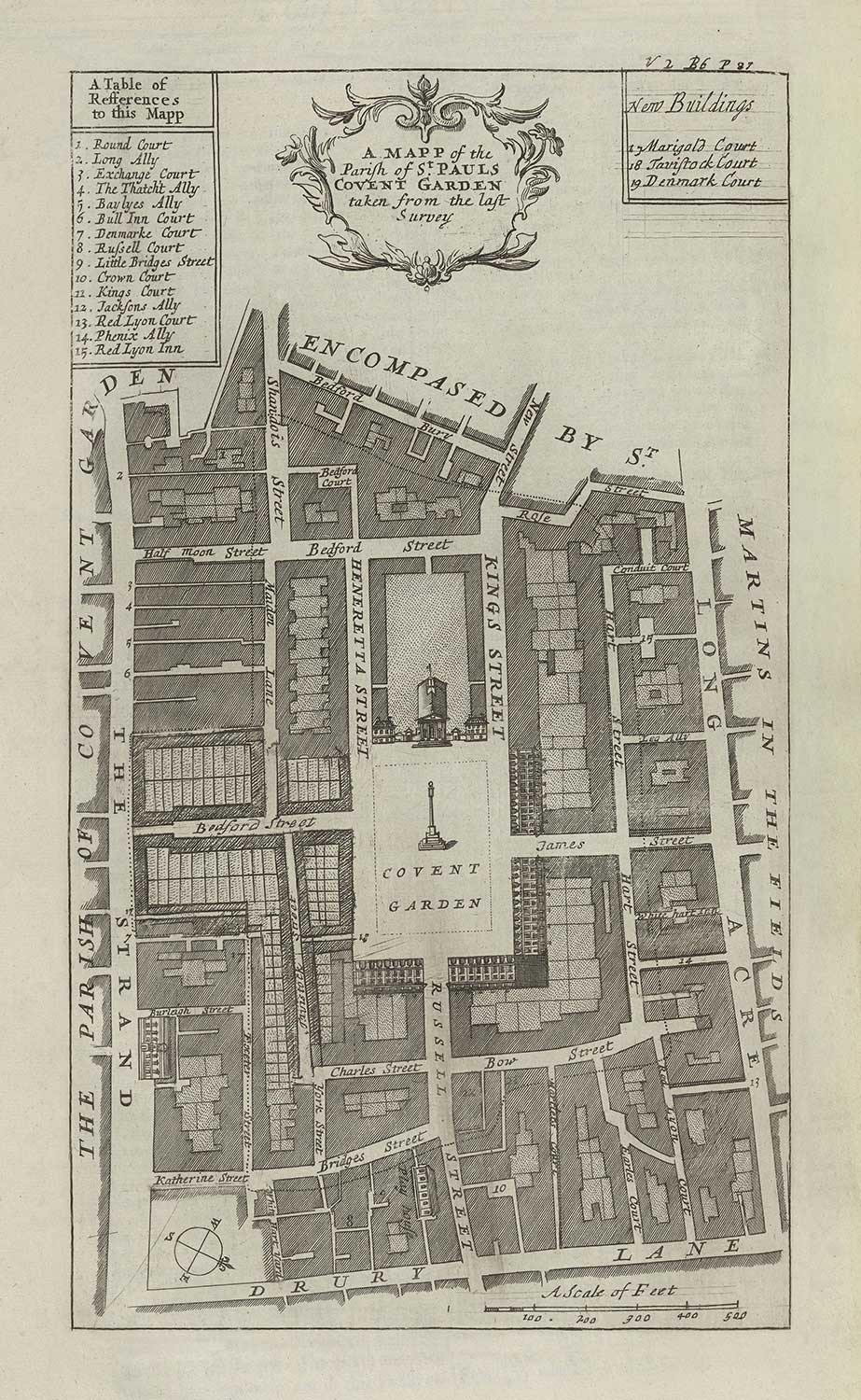 The locations on this map include: Covent Garden, St Paul’s Church (in Covent Garden), King Street, Surrey, Henrietta Street, Bedford Street, Russell Street, Drury Lane, Long Acre and Strand.
