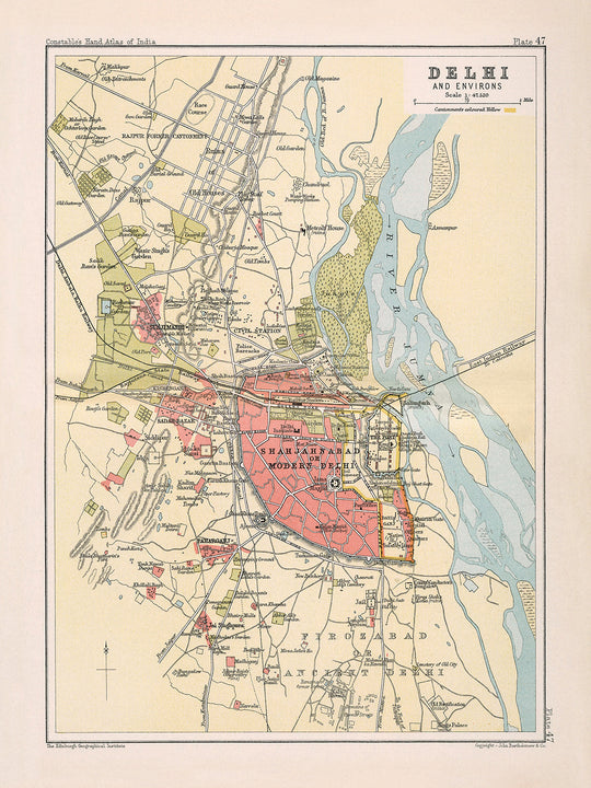 Bartholomew's use of color and hachures to indicate relief brings the map to life, offering a three-dimensional perspective of Delhi's terrain. The yellow-colored cantonments stand out, highlighting the military presence that was a significant aspect of the city's landscape during the colonial era. This map is not just a cartographic achievement; it is a historical document that encapsulates the essence of Delhi, making it a valuable addition to any collection of antique maps and a perfect piece for those who appreciate the rich tapestry of history and geography.