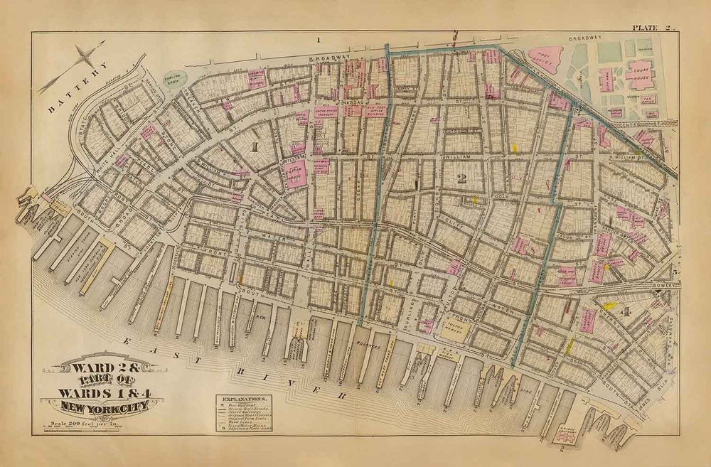 This map covers Ward 2 and parts of Ward 1 and 4 of New York City's historical municipal divisions, which equates to the modern-day Financial District and Civic Center in downtown Manhattan.