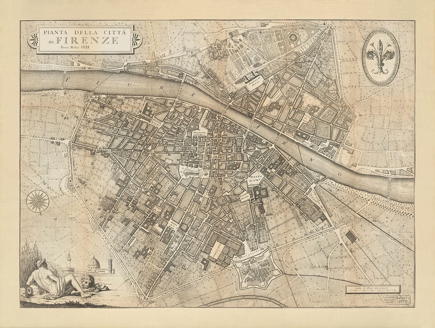 This map captures Florence at its peak, with all of its notable landmarks - including Ponte Vecchio, Palazzo Vecchio, the Duomo of the Cathedral of Santa Maria del Fiore, the Basilica of Santa Croce, Basilica di Santo Spirito, the Gallery Uffizi, Pitti Piazza, and many other palaces, cathedrals, piazzas and galleries.