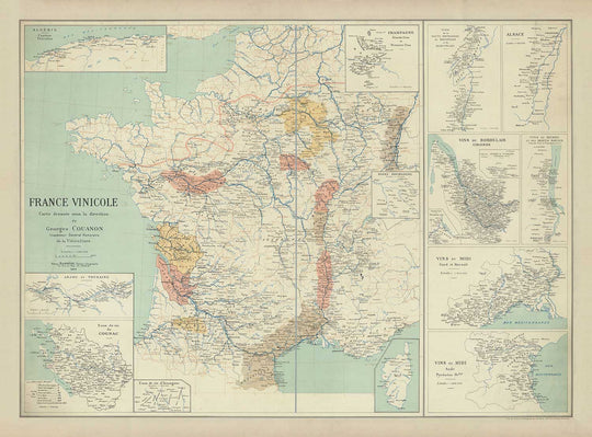 Old Map of French Wine Growing Regions, 1924: Bordeaux, Rhone, Champagne, Burgundy, Alsace, Cognac