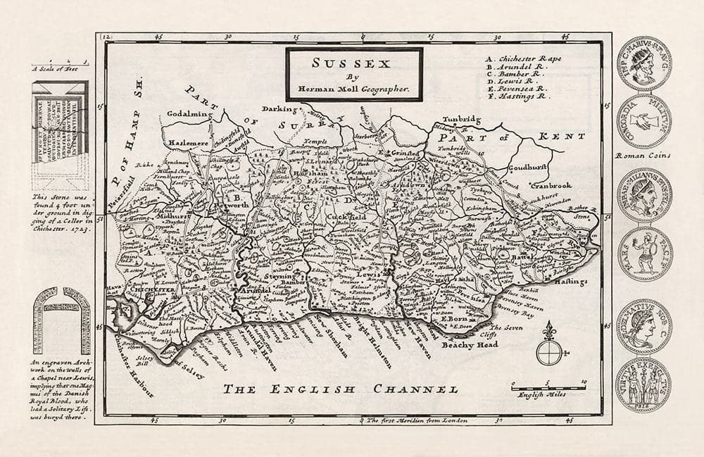Old Map of Sussex 1724, by Herman Moll: Worthing, Crawley, Brighton, Bognor, Eastbourne