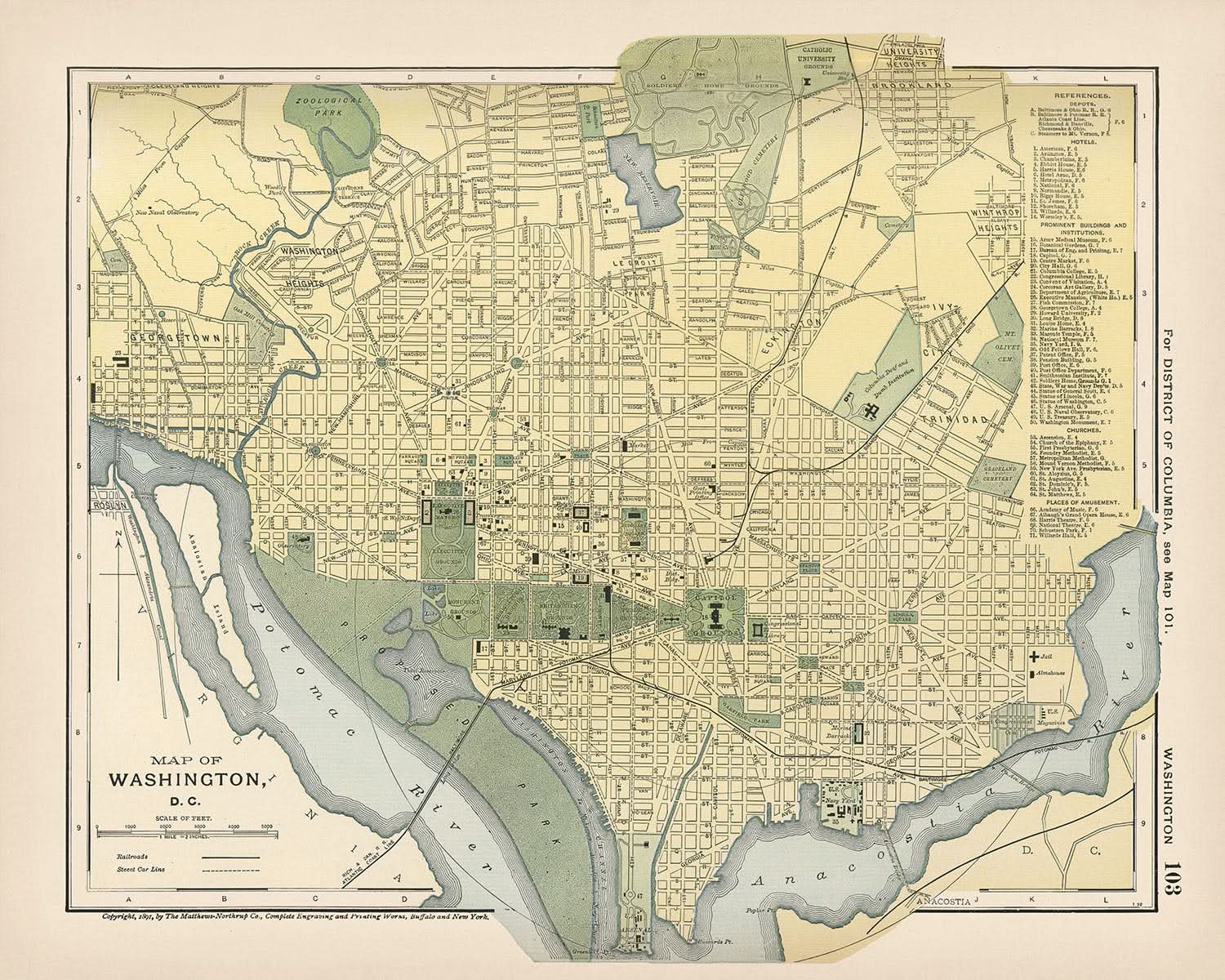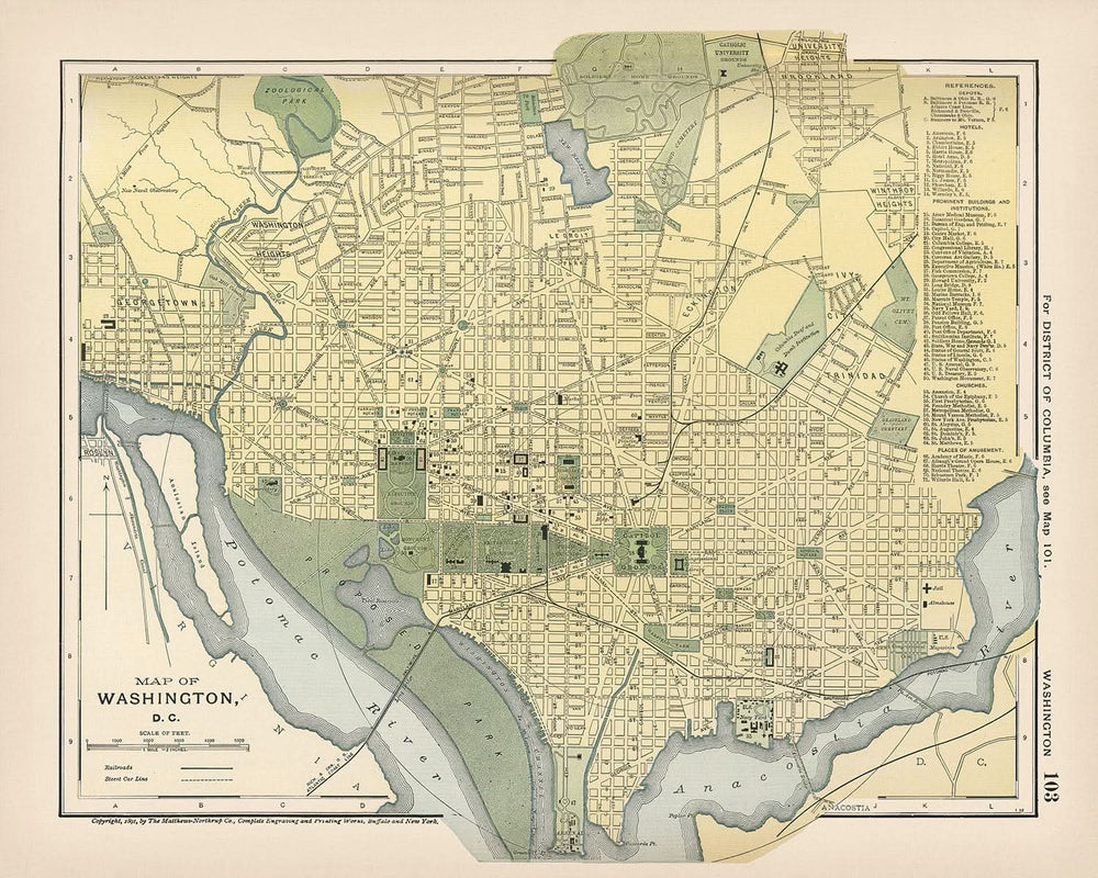 The natural beauty of Washington, D.C., is equally celebrated in this map, with large parks like the National Mall and the Zoological Park prominently featured. These green spaces provided urban dwellers with a respite from the bustling city life and were integral to the city’s design. The Tidal Basin, with its serene waters, is also depicted, offering a picturesque contrast to the urban environment and underscoring the city's harmonious blend of nature and architecture.