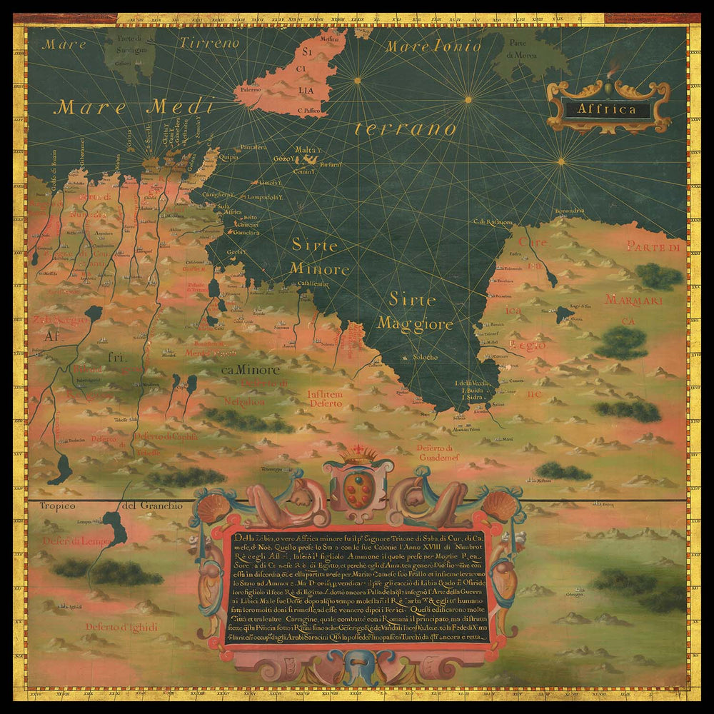 Della Libia o vero Affrica minore su il Po. Signore Tritone di Saba, di Cur, di Camese, di Noe is a captivating cartographic masterpiece from 1579, crafted by the esteemed Stefano Buonsignori. This map is a testament to the advanced geographical knowledge of the 16th century, commissioned as part of the Medici family's ambitious Hall of Maps in the Palazzo Vecchio, Florence. The Medici sought to encapsulate their power and influence through a grand display of global understanding, and this map stands as a vivid representation of their vision.