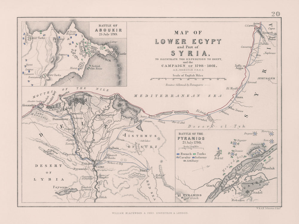 Step into the world of late 18th-century geopolitics with this exquisite map of Lower Egypt and part of Syria, crafted by the renowned W. & A.K. Johnston of Edinburgh in 1801. This map is a testament to the tumultuous era of the French Revolution and Napoleonic Wars, providing a detailed depiction of the French campaign in Egypt and Syria from 1798 to 1801. With its intricate engravings and hand-colored details, this map is not just a geographical representation but a historical document that captures the strategic maneuvers of the time.