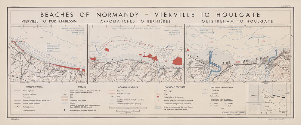 Immerse yourself in a pivotal moment of history with the "Beaches of Normandy - Vierville to Houlgate" map, an exquisite piece crafted by the United States Office of Strategic Services in 1943. This topographic masterpiece captures the intricate details of the Normandy coastline, a region that played a crucial role during World War II. The map meticulously outlines the coastal geography, showcasing offshore features, tide currents, and the composition of sea floor sediments. Its precision and detail offer a glimpse into the strategic planning that preceded the iconic D-Day landings, making it a valuable artifact for history enthusiasts and collectors alike.