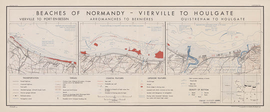 Featuring key locations such as Vierville, Port-en-Bessin, and Arromanches, the map transports you to the heart of the Normandy landings. These beaches, etched in history as the sites of immense bravery and sacrifice, are depicted with precision, illustrating the challenges faced by the Allied forces. The map also includes detailed information on transportation routes, coastal defenses, and potential landing sites, offering a comprehensive view of the strategic landscape during one of history's most significant military operations.