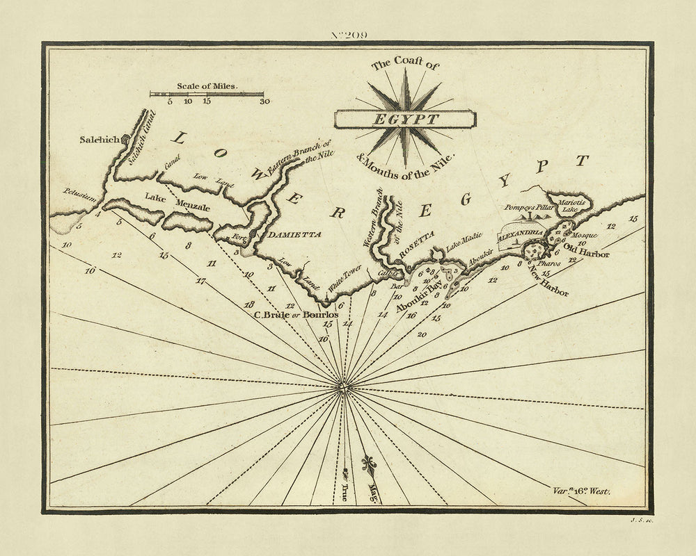 The map's design is both functional and aesthetically pleasing, featuring a classic compass rose and a scale of miles that exemplify the era's cartographic standards. These elements not only add to the map's utility but also its charm, capturing the essence of maritime exploration during the period. The careful plotting of the Nile's mouths and the surrounding topography offers a vivid portrayal of the region's geography, making it a valuable educational tool for those interested in the natural and political history of the area.