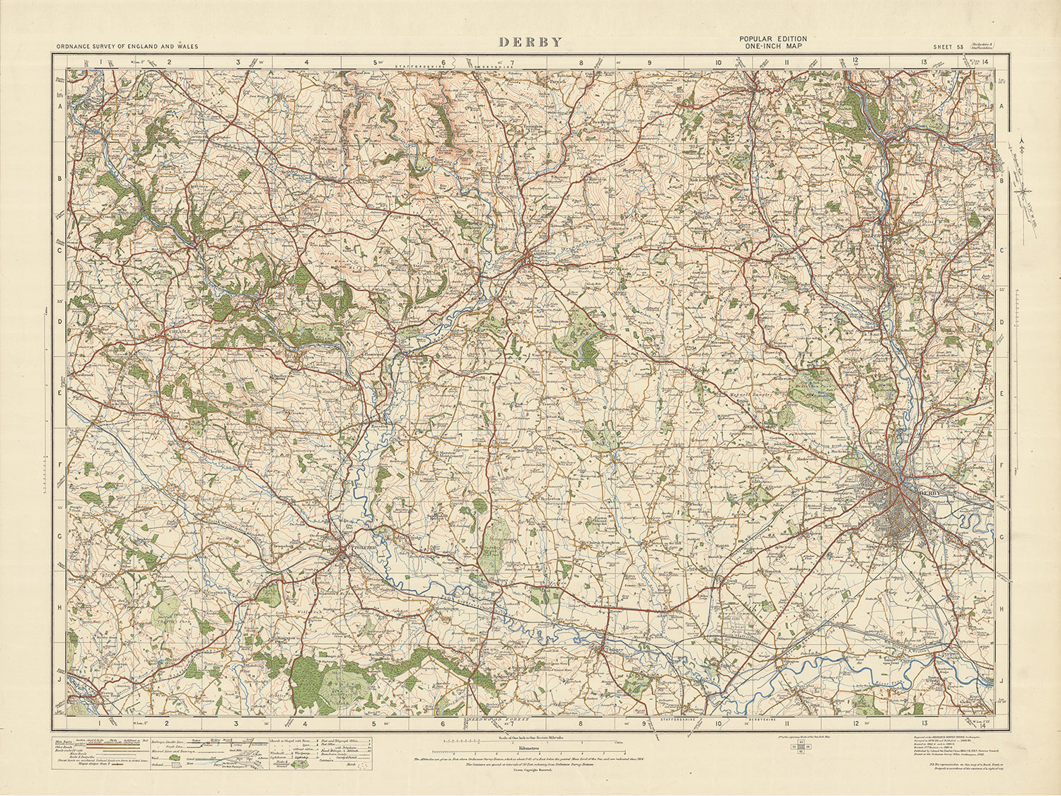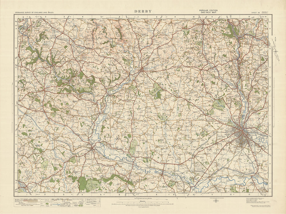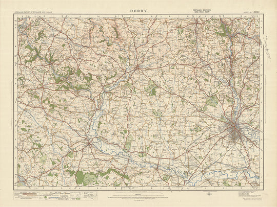 This remarkable map, titled "Sheet 53 - Derby," is part of the Ordnance Survey's One-inch "Popular" edition of England and Wales, published in 1925. The map showcases the historic county of Derbyshire, with a particular focus on the city of Derby and its surrounding towns and features. It provides a fascinating glimpse into the landscape, settlements, and historical context of the region during the early 20th century.