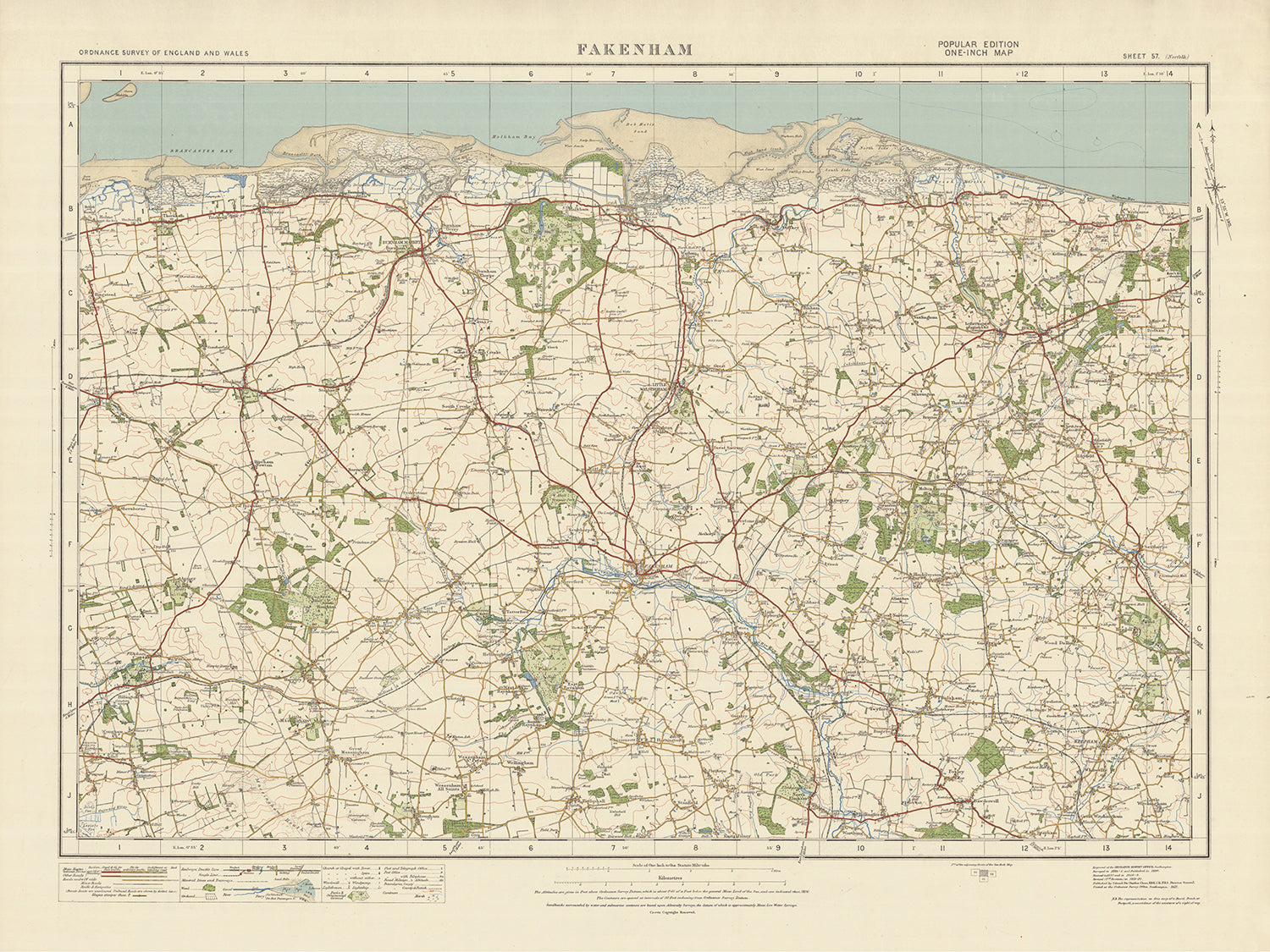 The "Sheet 57 - Fakenham" map from Ordnance Survey's One-inch "Popular" edition, England and Wales, published in 1925, is a remarkable piece of cartographic history. This map showcases the towns, cities, and interesting features of Fakenham, Holt, Burnham Market, Little Walsingham, Briston, and the Norfolk Coast Area of Outstanding Natural Beauty (AONB).