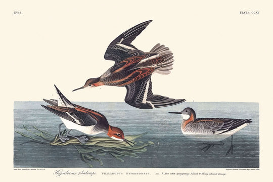 This print not only celebrates Audubon's artistic legacy but also preserves the charm of a species whose striking behavior and migratory patterns fascinated 19th-century naturalists. From the Bay of Fundy sightings during migrations to their breeding habits in Labrador, the Hyperborean Phalarope invites curiosity and admiration, making this print a compelling addition to any collection.