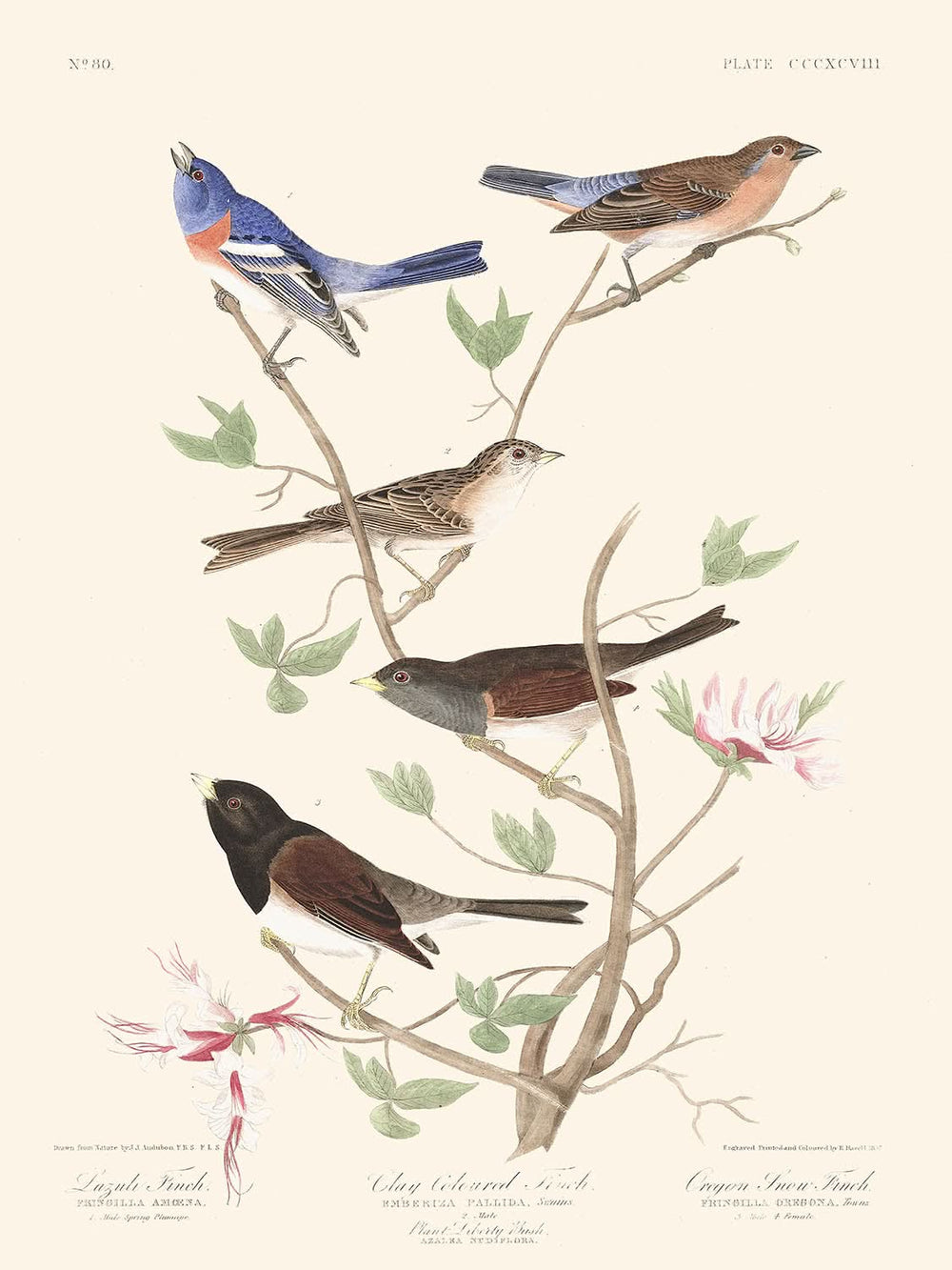 Lazuli Finch, Clay-coloured Finch, Oregon Snow Finch, first published in 1827, is a stunning piece from the celebrated collection "The Birds of America" by John James Audubon. Audubon, a revolutionary American ornithologist and painter, is renowned for his detailed illustrations of birds. This piece, part of his seminal work, captures the vibrant life and intricate details of American bird species.