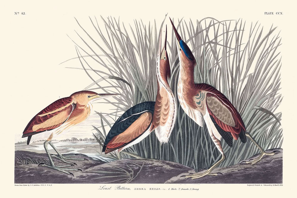 John James Audubon’s "Least Bittern" (Plate 210), first published in 1827, is a captivating illustration from his renowned series, "Birds of America." This artwork blends art and nature, capturing the grace and subtle beauty of a bird known for its elusive nature and remarkable ability to blend into its marshy surroundings.
