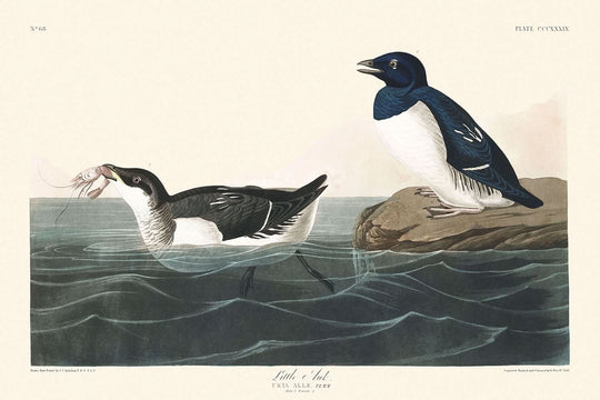 Little Auk, illustrated by John James Audubon and first published in 1827, is a captivating piece that belongs to his seminal work, The Birds of America. Known for his vivid and lifelike depictions, Audubon's meticulous work marvelously captures the essence of the bird known scientifically as Alca impennis, or more commonly, the Great Auk.
