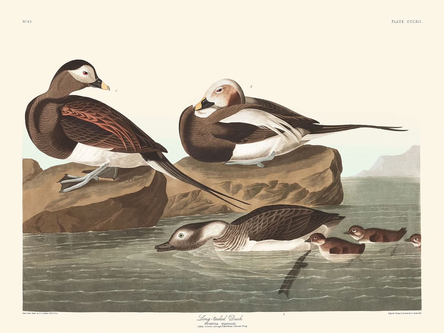 Long-tailed Duck (Plate 312) by John James Audubon, first published in 1827, is an exquisite illustration from his celebrated series, "The Birds of America." The artwork captures the essence of the Long-tailed Duck amidst its natural habitat, offering a glimpse into the intricate behaviors and life of this fascinating species.