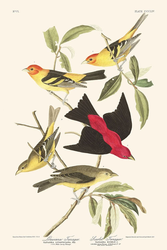 Louisiana Tanager and Scarlet Tanager by John James Audubon is a captivating bird illustration from the renowned Birds of America series, first published in 1827. This remarkable work showcases the meticulous and vibrant artistry of one of America's most celebrated naturalists and ornithologists.
