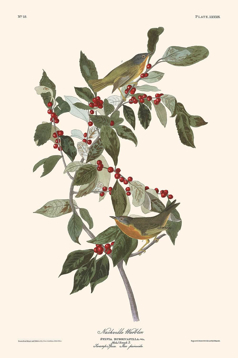 Audubon’s Nashville Warbler is an exquisite representation of both artistry and ornithological expertise. Originally, Audubon encountered only several specimens in places like Louisiana and Kentucky. He brought his observations to life in this diminutive bird with superb attention to detail—from its brownish-green upper feathers to the striking greenish-yellow beneath, and a hint of distinctive dark red on the male’s crown. His artful depiction also includes elements of its natural habitat, such as the swamp spice (Ilex prinoides), adding botanical interest.