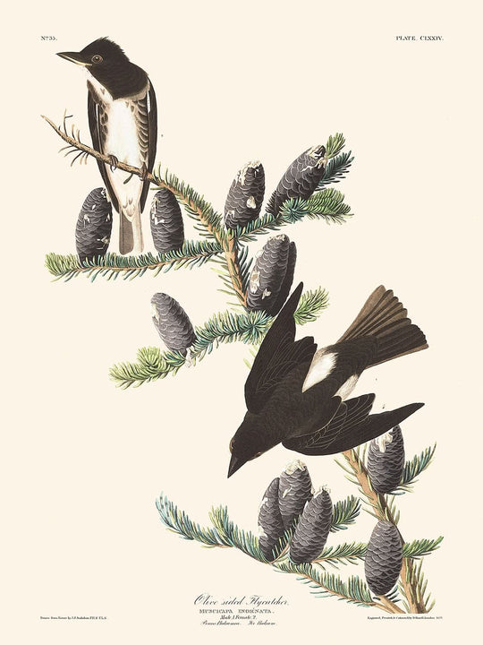 Owning this print is like possessing a piece of natural history, capturing the unique plumage colors and characteristics of the Olive-sided Flycatcher. The meticulous detailing of the bird’s features and its surroundings offers a glimpse into the art and science of Audubon's era, making it an invaluable addition for any bird lover or art collector.