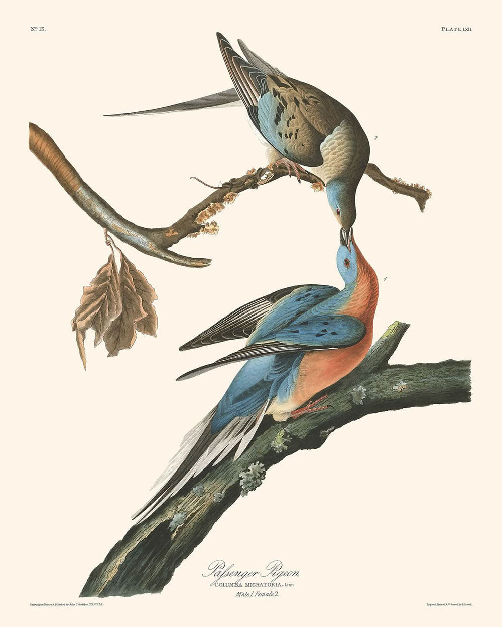 Passenger Pigeon (Plate 62) is a captivating illustration by John James Audubon, first published in 1827 as part of his monumental work, The Birds of America. This piece stands as a testament to Audubon’s extraordinary skill in capturing the natural world, both in its vibrant detail and its evocative portrayal of one of nature's most remarkable avian phenomena—the formerly abundant Passenger Pigeon, scientifically known as Columba migratoria.