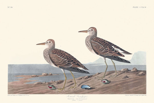 Introducing the captivating "Pectoral Sandpiper," an exquisite illustration from the renowned "Birds of America" series by John James Audubon, first published in 1827. This meticulous depiction captures the elegance and natural grace of the Pectoral Sandpiper, a bird acclaimed for its presence along the Eastern coasts of the United States and even as far as England.