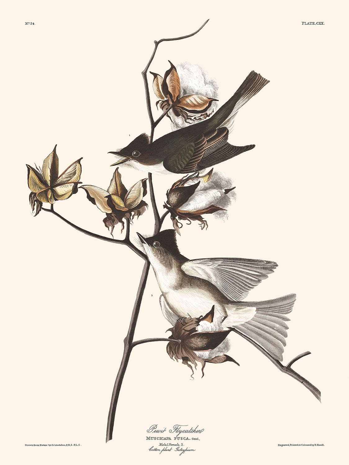 Pewit Flycatcher, created by the renowned John James Audubon in 1827, is a captivating illustration from his celebrated series, Birds of America. This artwork vividly captures the uniqueness of the species found by Audubon on the coast of Labrador—a discovery he initially mistook for the Common Pewee Flycatcher but later recognized for its distinct characteristics.
