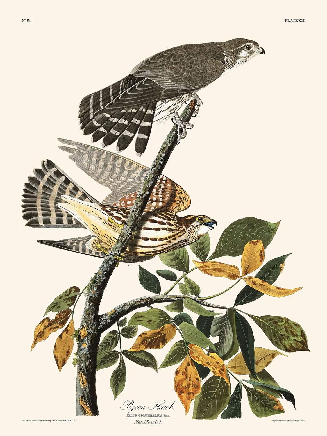 Pigeon Hawk (Plate 92) by John James Audubon, first published in 1827, is a captivating bird illustration from Audubon's celebrated series, Birds of America. This illustration not only captures the majestic and elusive nature of the Pigeon Hawk but also delves into its widespread presence across the United States and beyond, painting a vivid story of its migratory patterns and habitats.